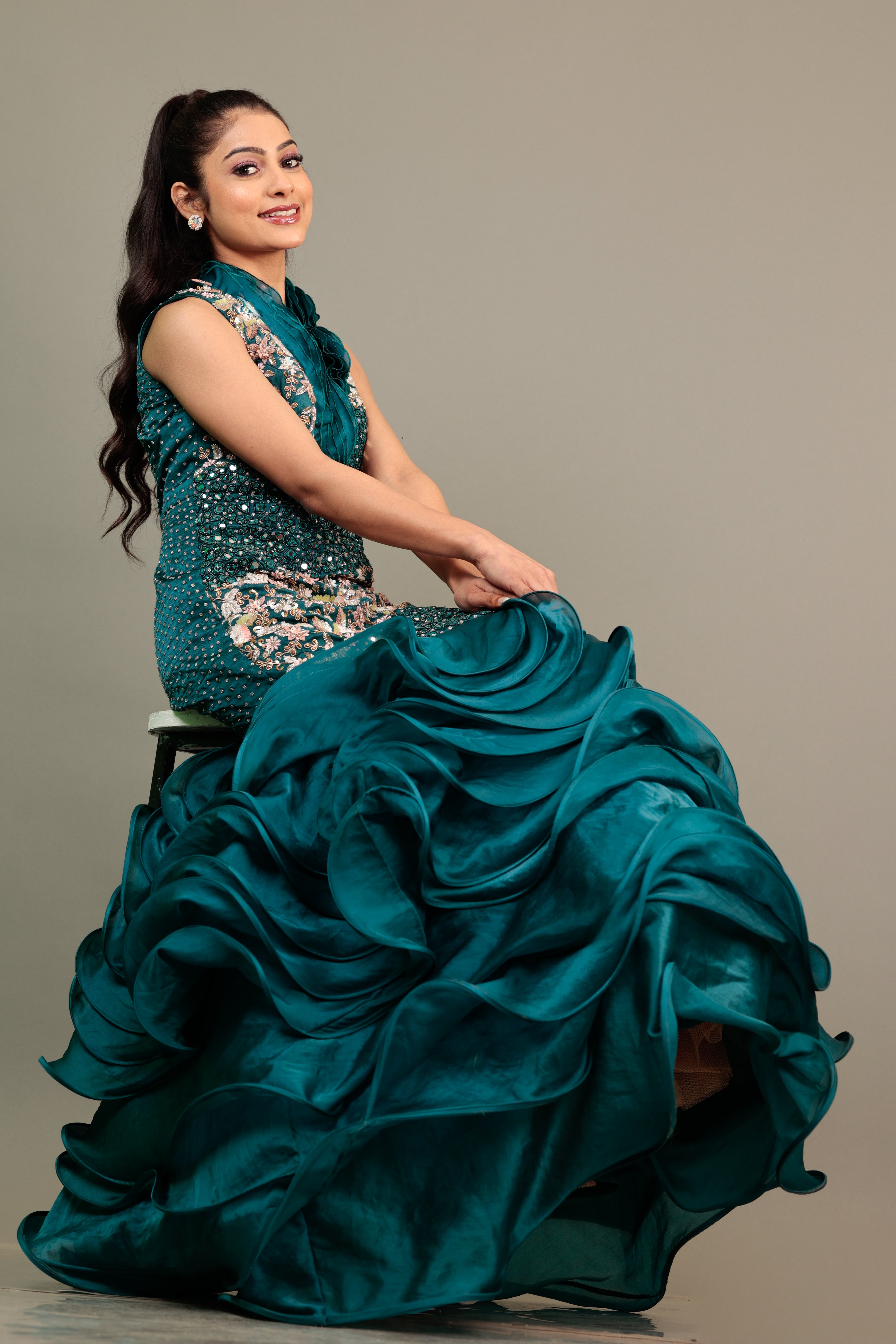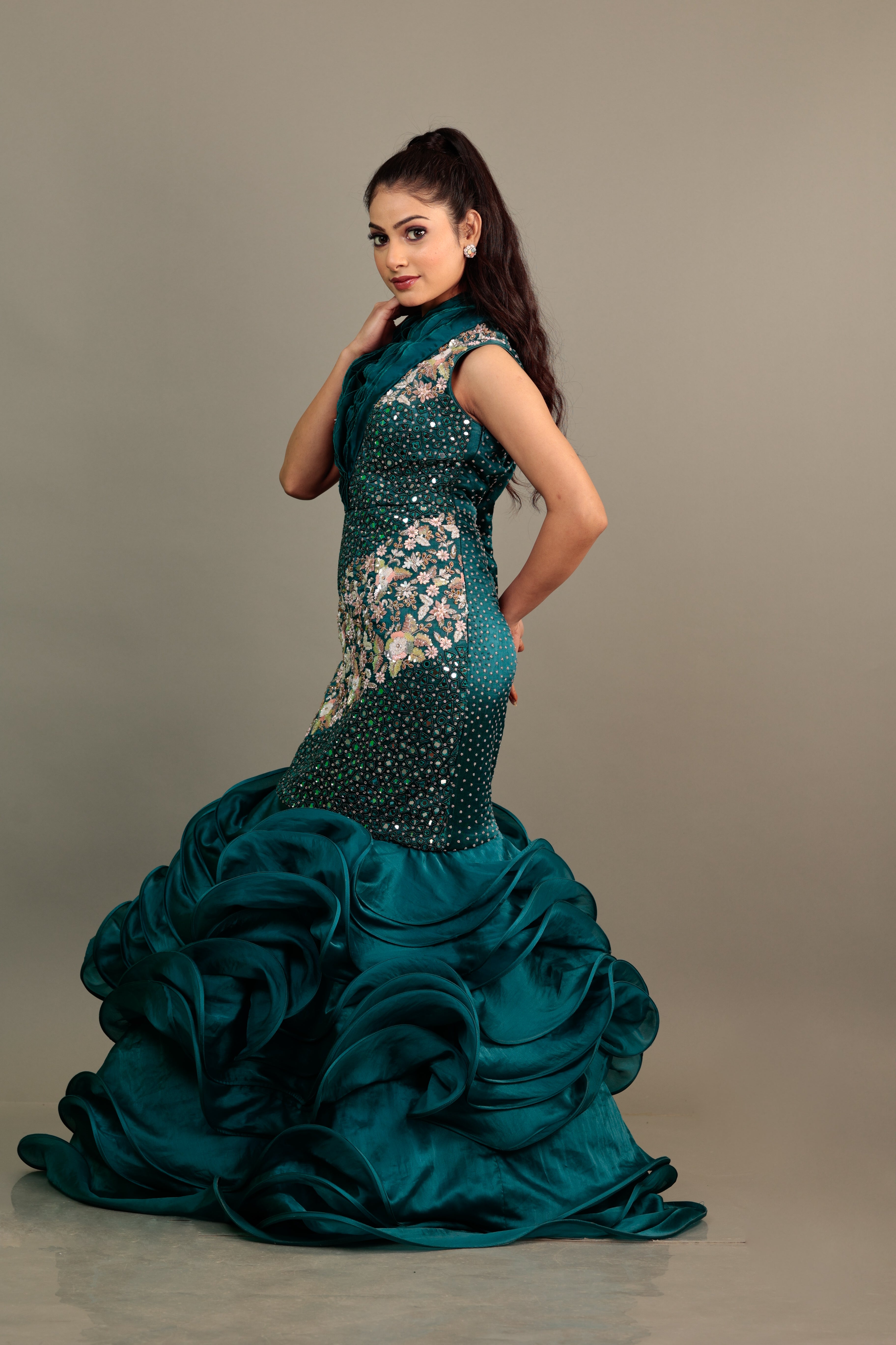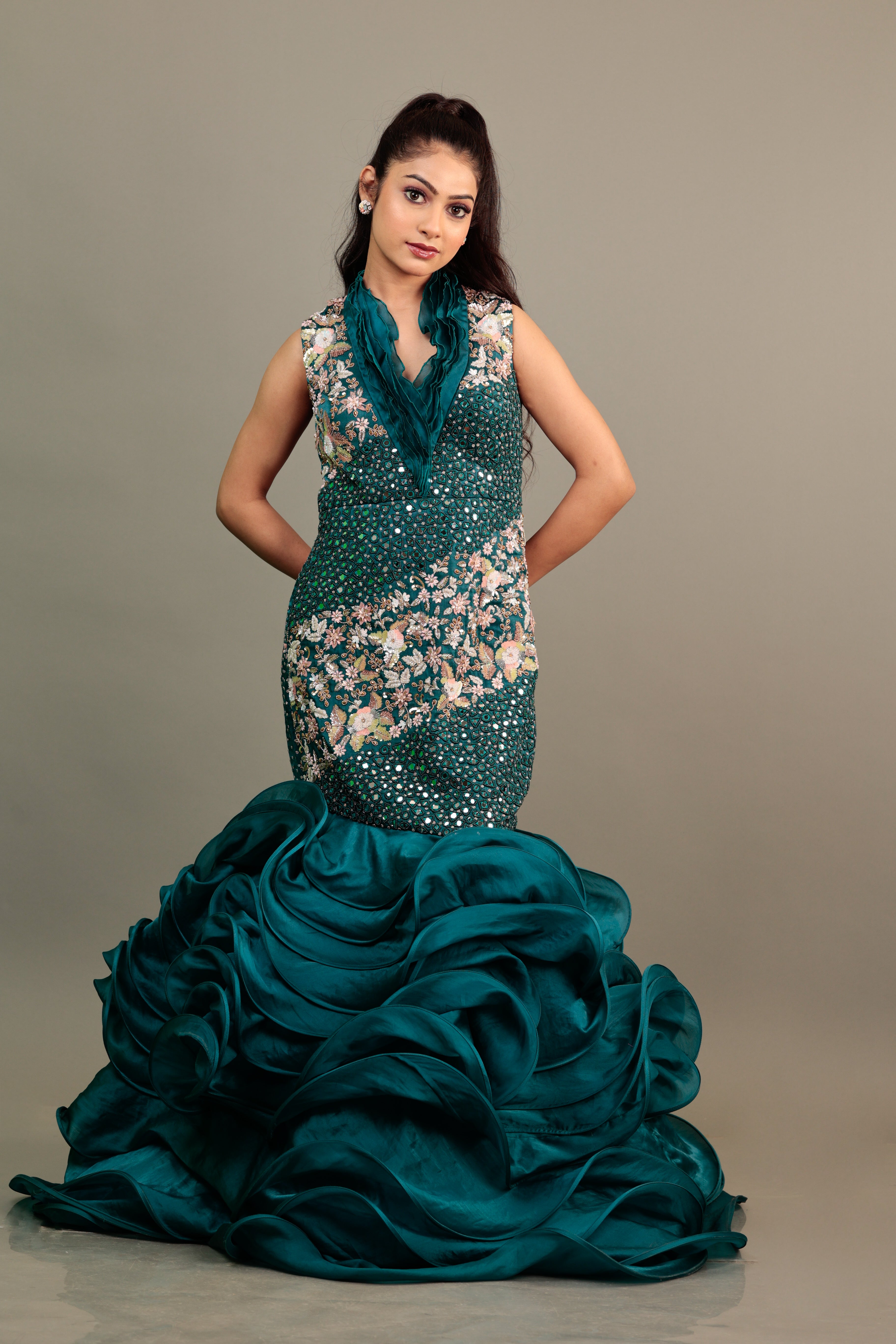 Aina-e-Sitara. This gorgeous fish-cut gown from our Celestia line will let you embrace a celestial sparkle. The ruffled skirt produces a swirling, starlit illusion, while exquisite appliqu flowers, mirrored embellishments, and intricate hand stitching give depth and shine. The captivating concept of a "star's mirror" is reflected in every aspect, giving Aina-e-Sitara a truly cosmic statement.