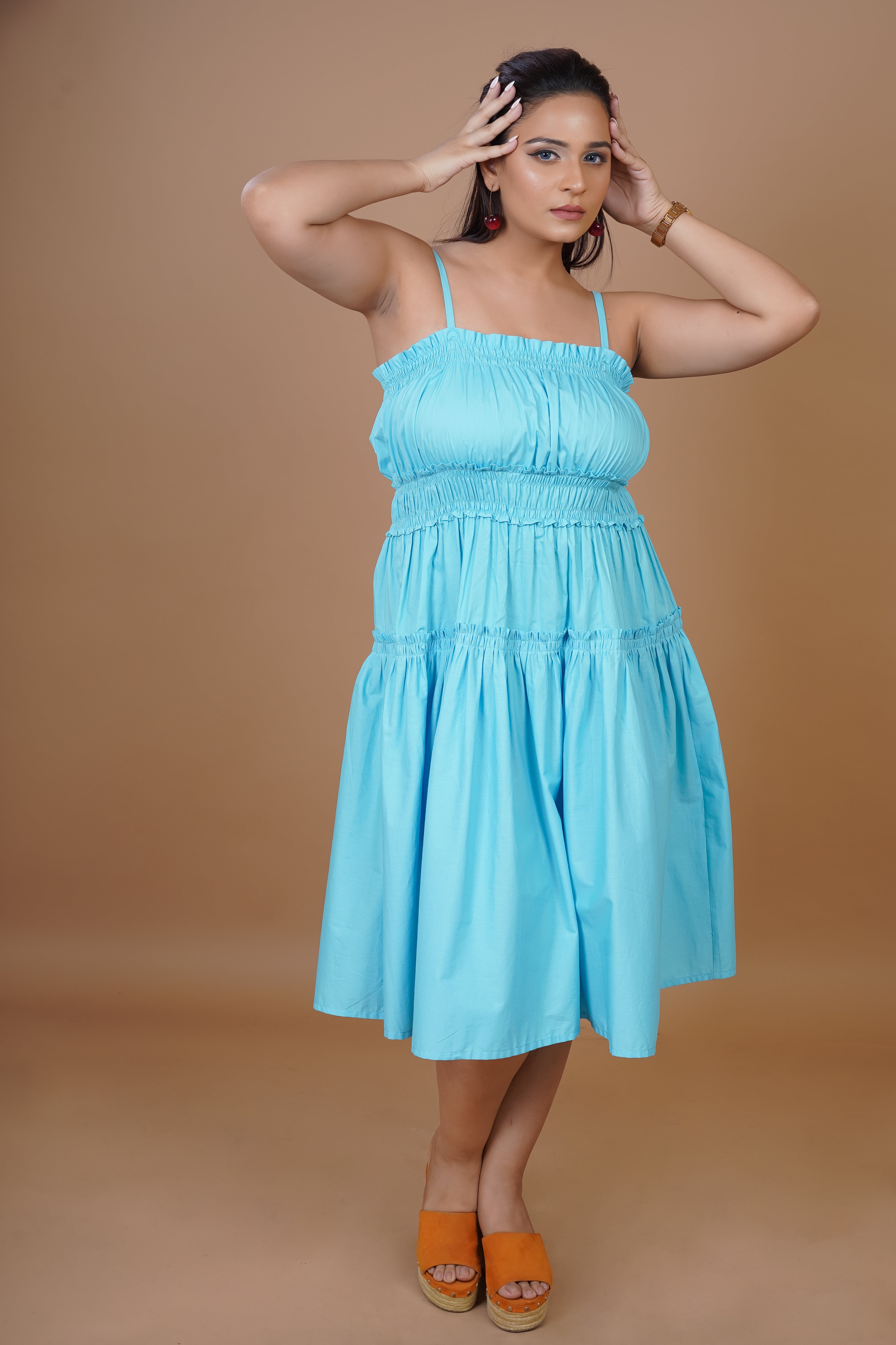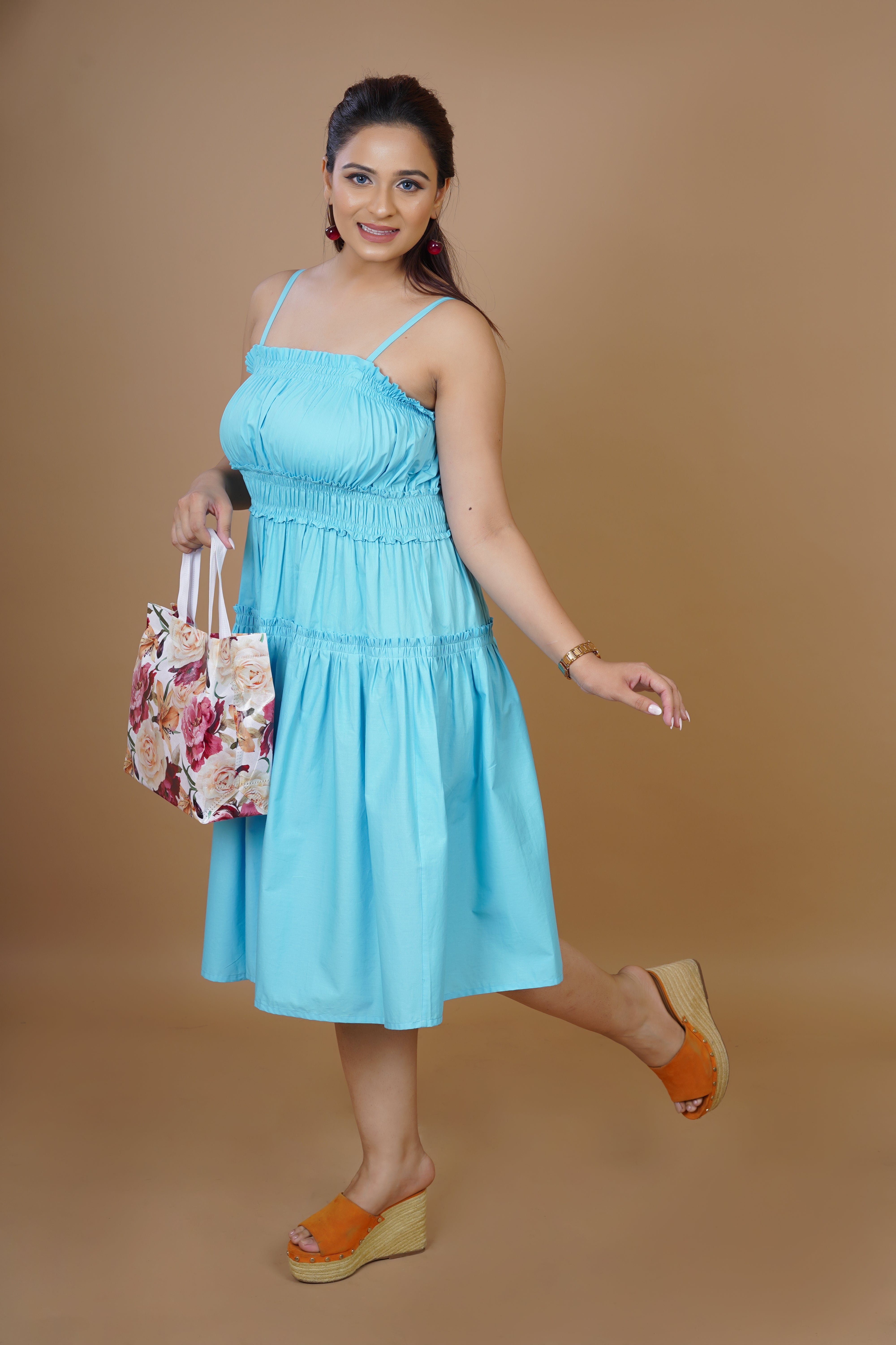 Effortlessly Chic And Irresistibly Comfortable, This Sky-Blue Midi Dress From Our Easy Breezy Collection Is Designed For Carefree Summer Days. Crafted From Breathable Cotton Poplin, It Features Delicate Spaghetti Straps, A Flattering Smocked Bodice, And A Gracefully Flared Silhouette That Moves With You. Perfect For Brunches, Vacations, Or A Casual Day Out, This Dress Combines Elegance With Ease. Style It With Your Favourite Sandals For A Relaxed Yet Polished Look!