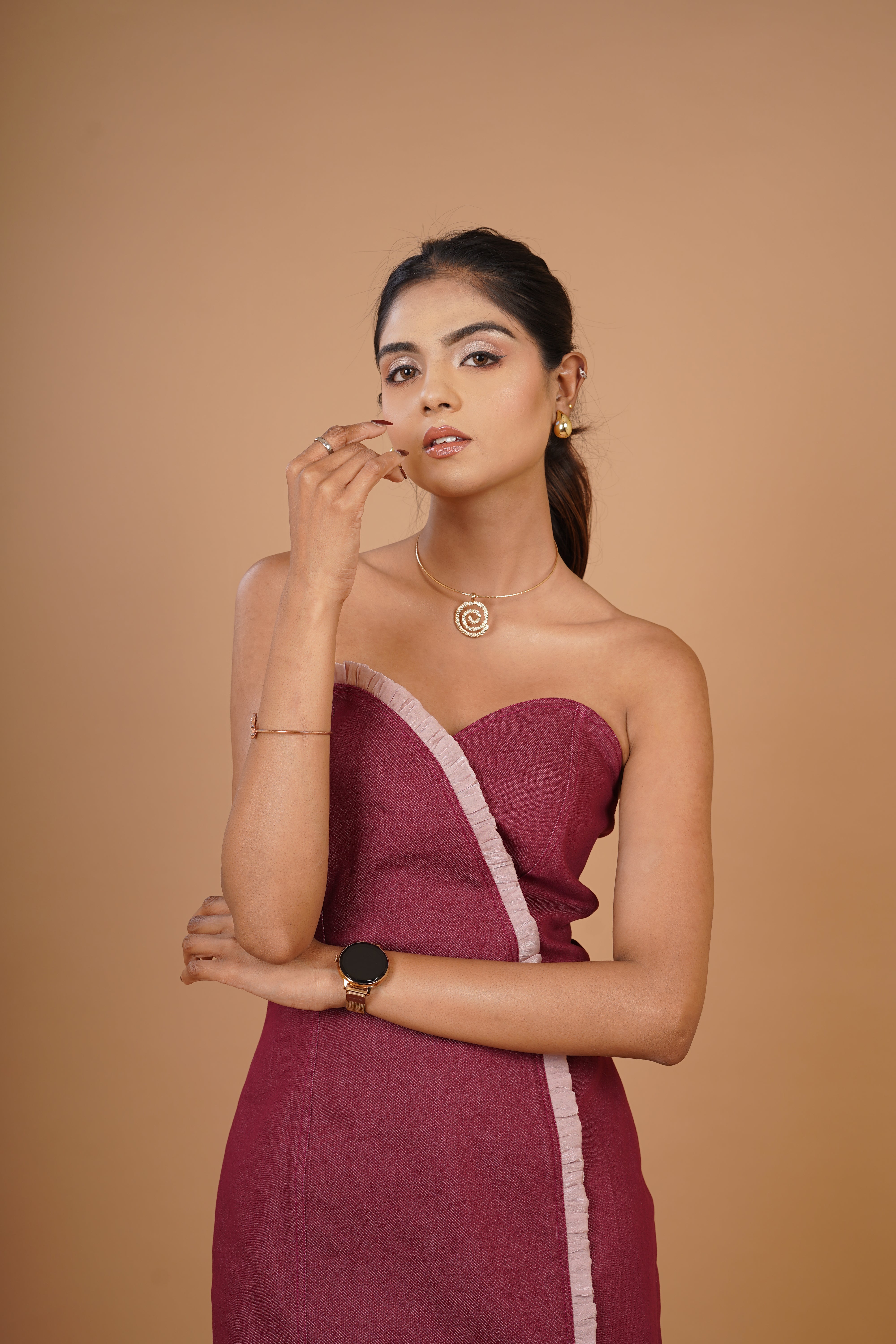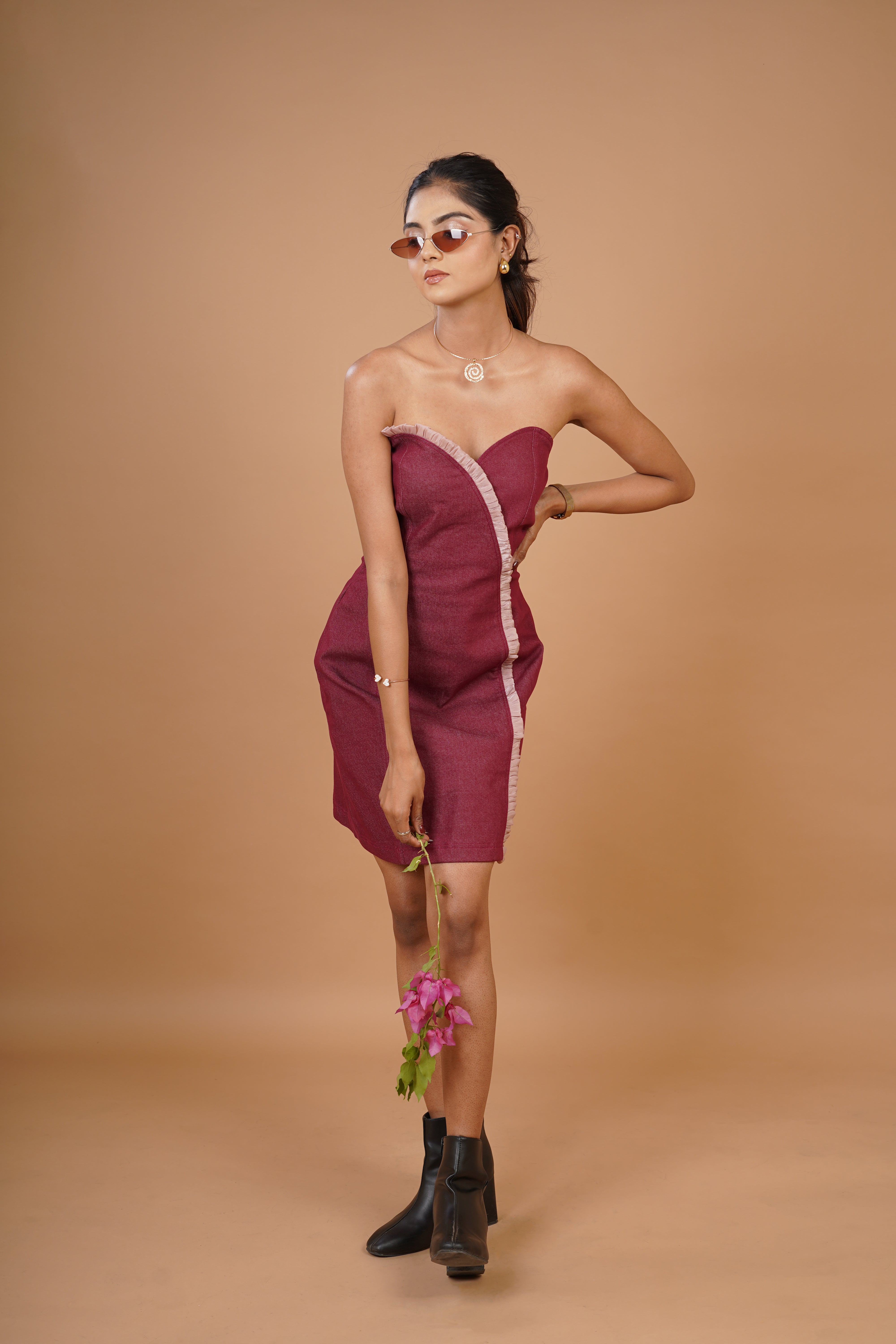 Elevate your wardrobe with the Berry Rush Dress, a perfect fusion of feminine charm and structured elegance. Crafted from premium denim in a rich berry hue, this dress features a statement sweetheart neckline, accentuated by a delicate self-fabric ruffle that adds a touch of softness to its bold silhouette.