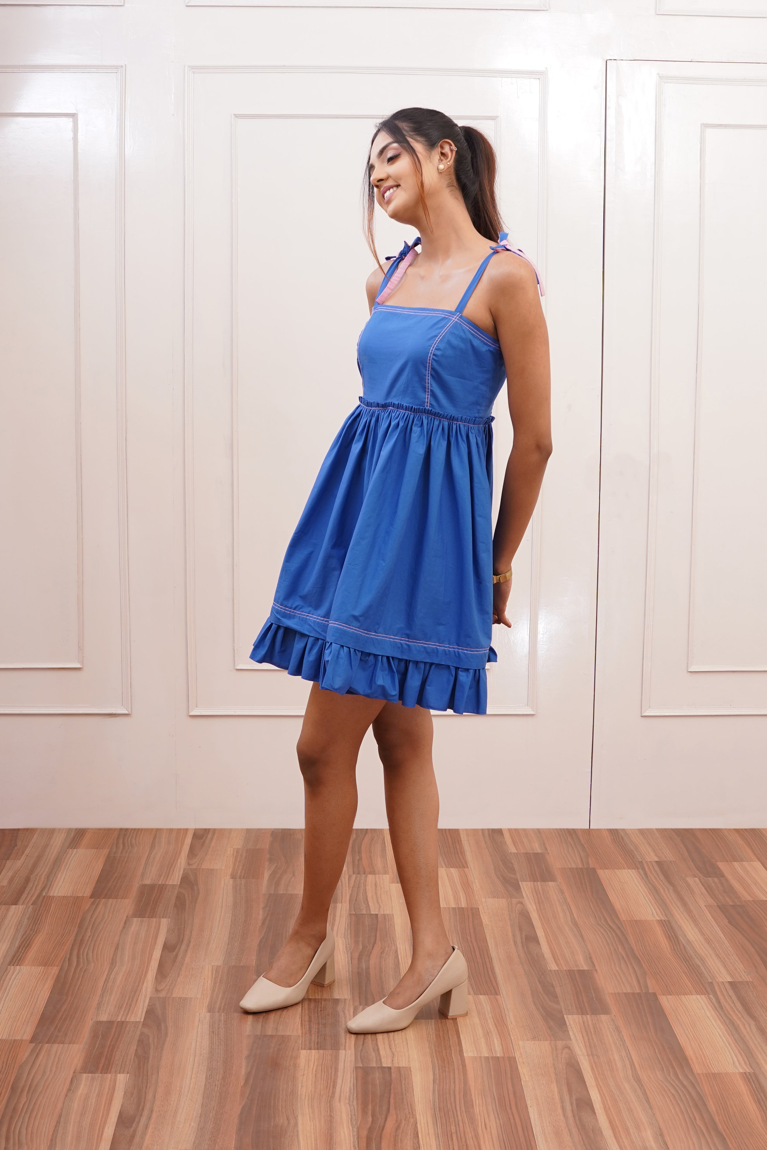 Blue fairy Playful, Chic & Oh-So-Breezy, Set sail in Blue Fairy, a dress that captures the carefree spirit of summer. With delicate tie-up shoulder straps, a fitted bodice, and a voluminous ruffle hem, this dress is all about effortless charm. The rich blue hue adds a touch of vibrancy, making it perfect for sunny day adventures, brunch dates, or a twirl-worthy moment. Light, breezy, and endlessly stylish this dress is your passport to fun and fashion!