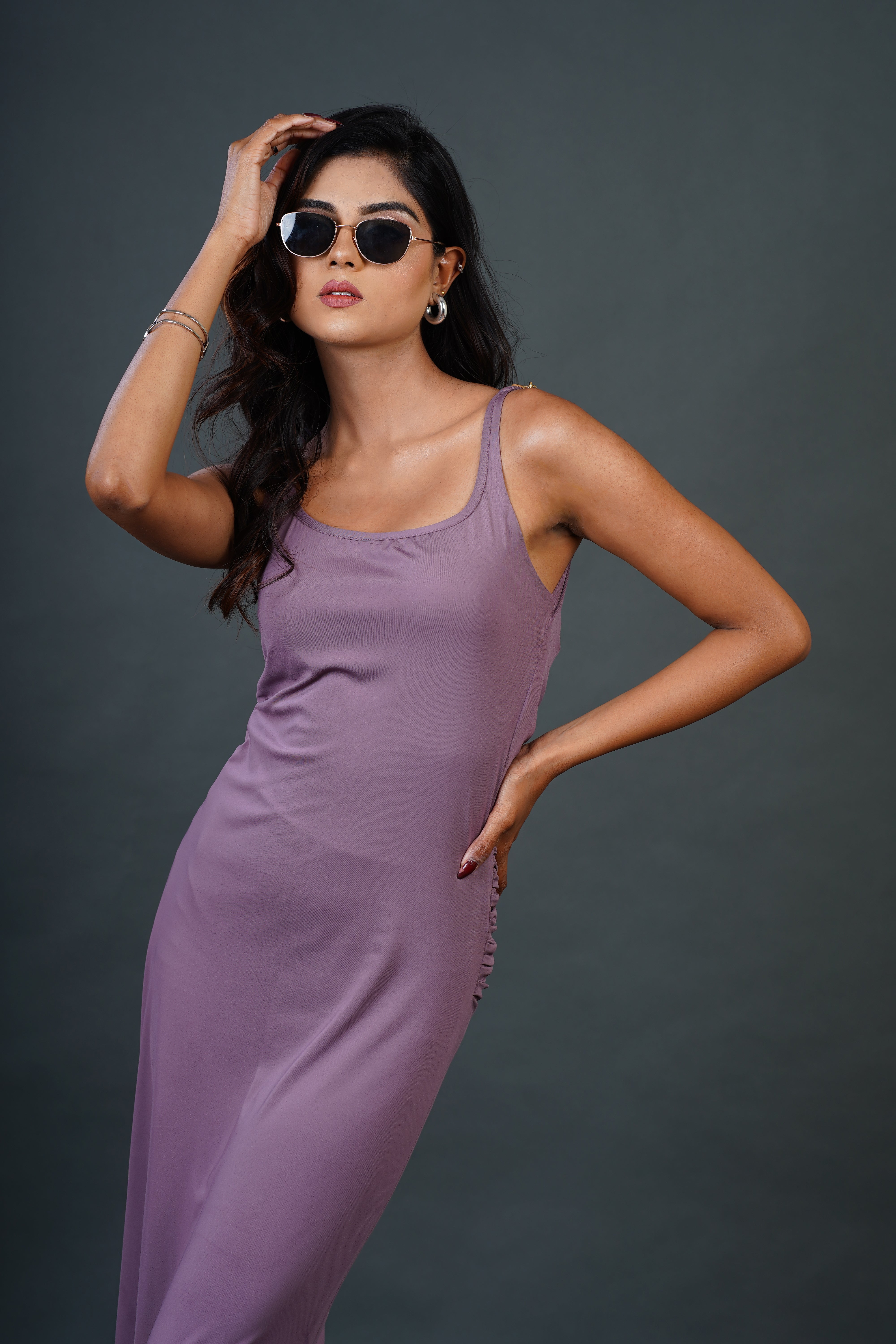 Unveil effortless sophistication with Dusky Drapes, a chic midi dress designed to flatter and sculpt your silhouette. Crafted from buttery-soft Lycra fabric, this dress drapes fluidly, offering both comfort and elegance.