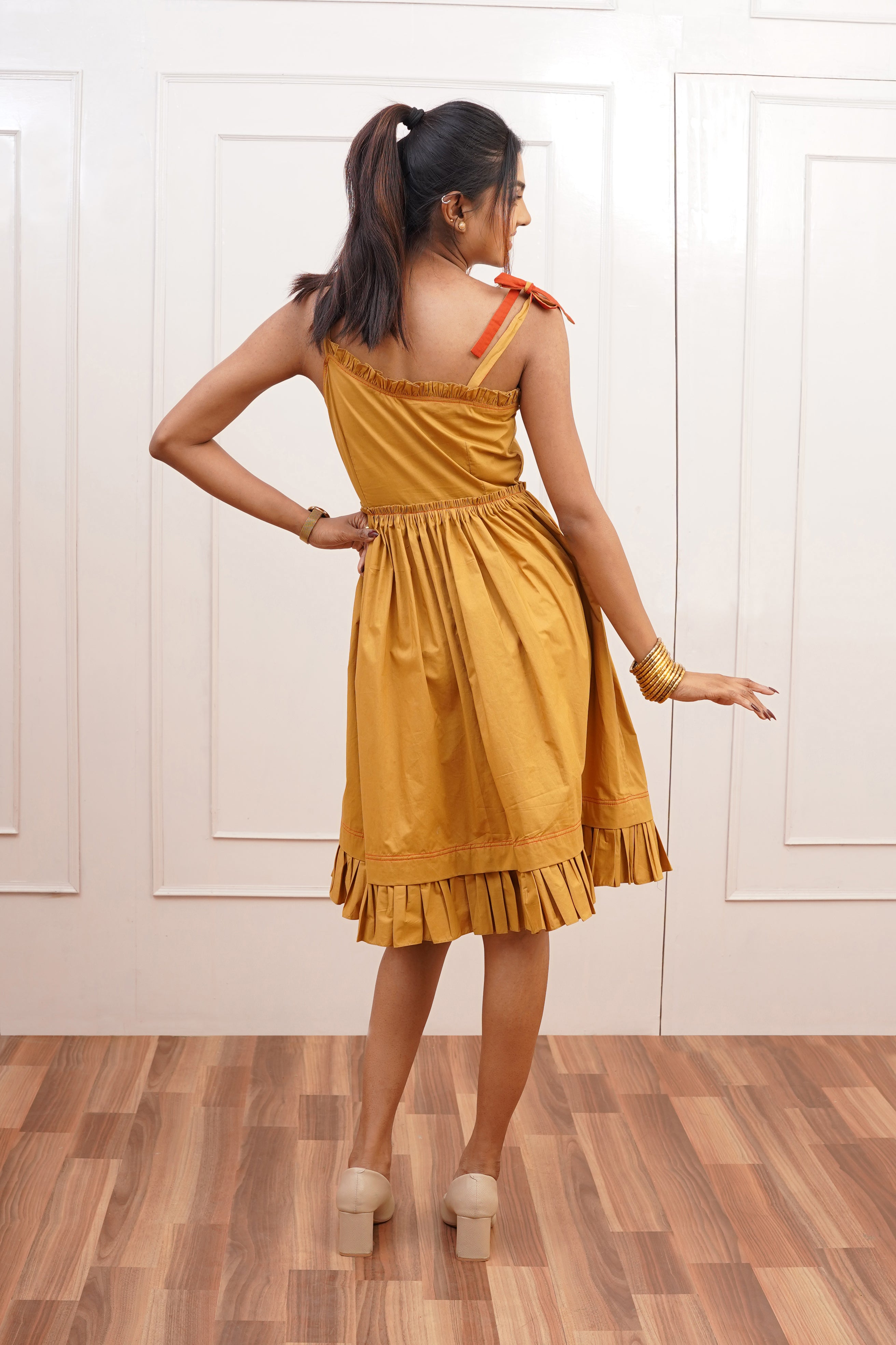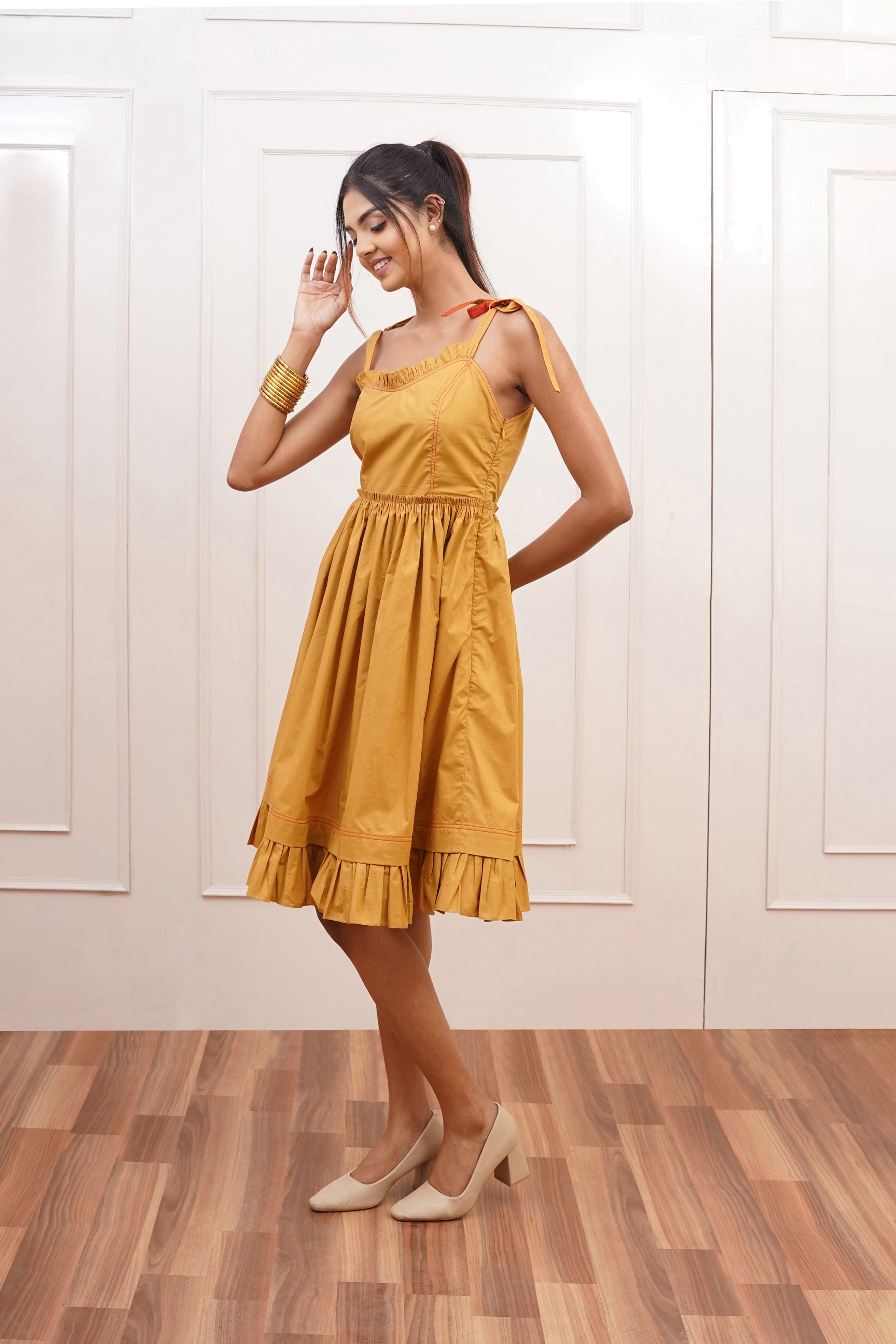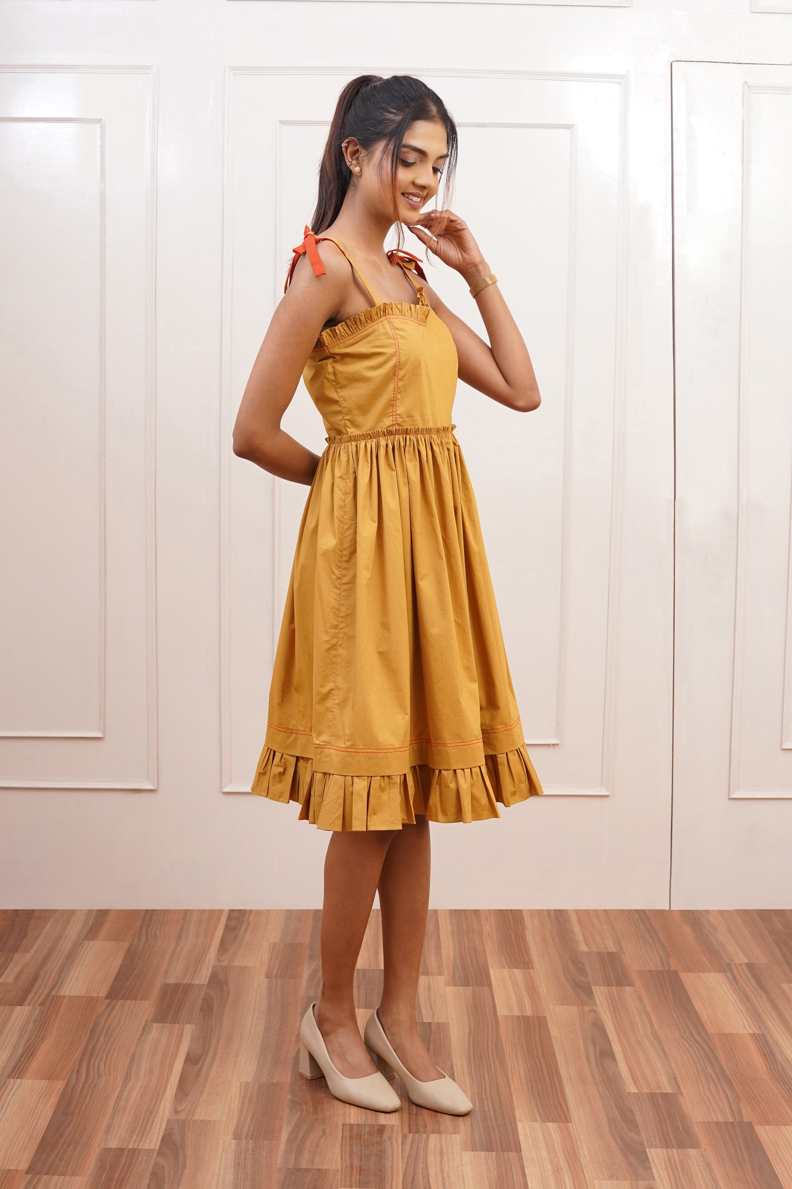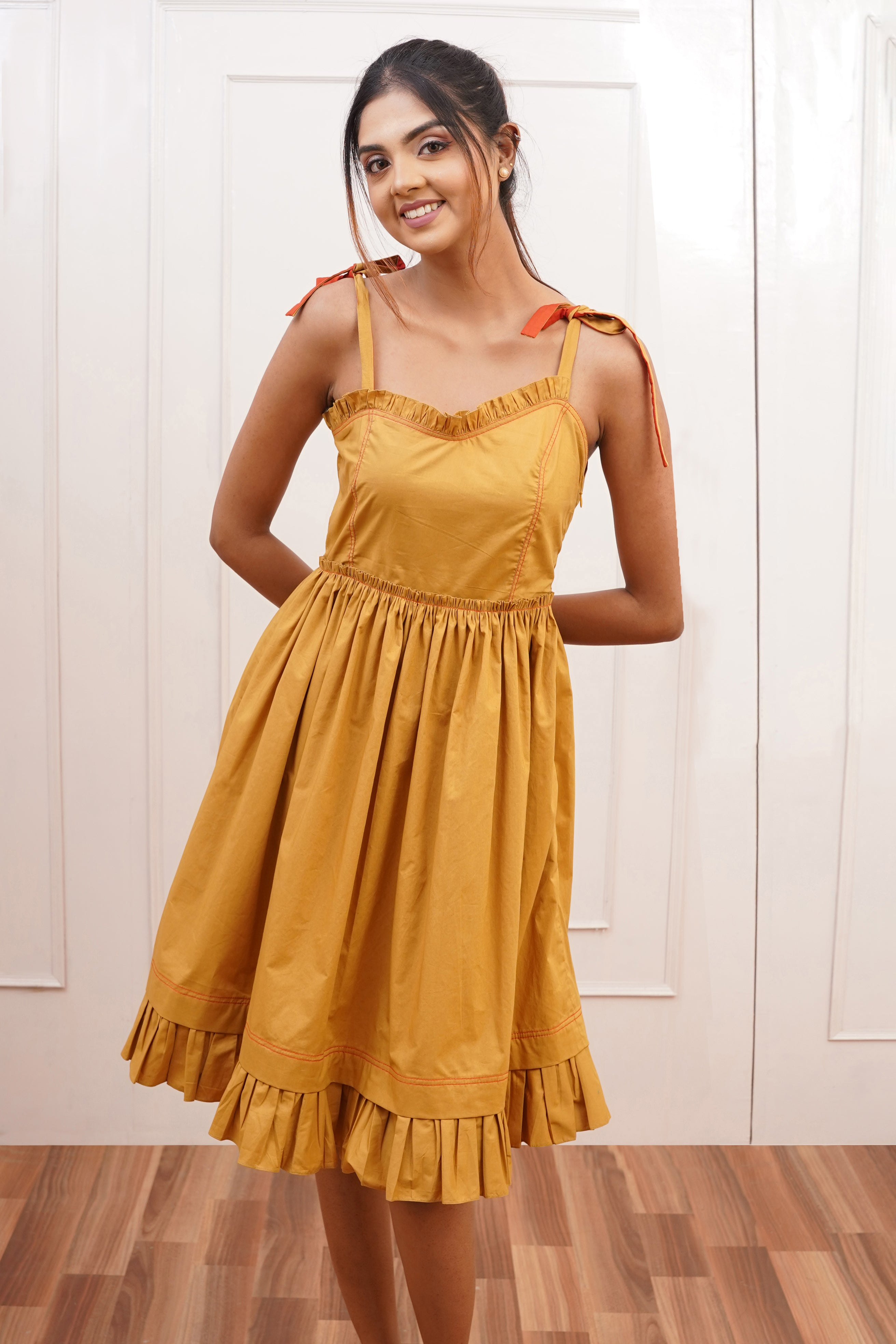 Draped in the richness of marigolds, Marigold Muse is where comfort meets charm. Crafted from airy cotton, this midi dress features dainty tie-up straps and ruffled hems that add a playful touch. Whether you're strolling through sunlit streets or enjoying a cozy brunch, this dress ensures you do it in style.