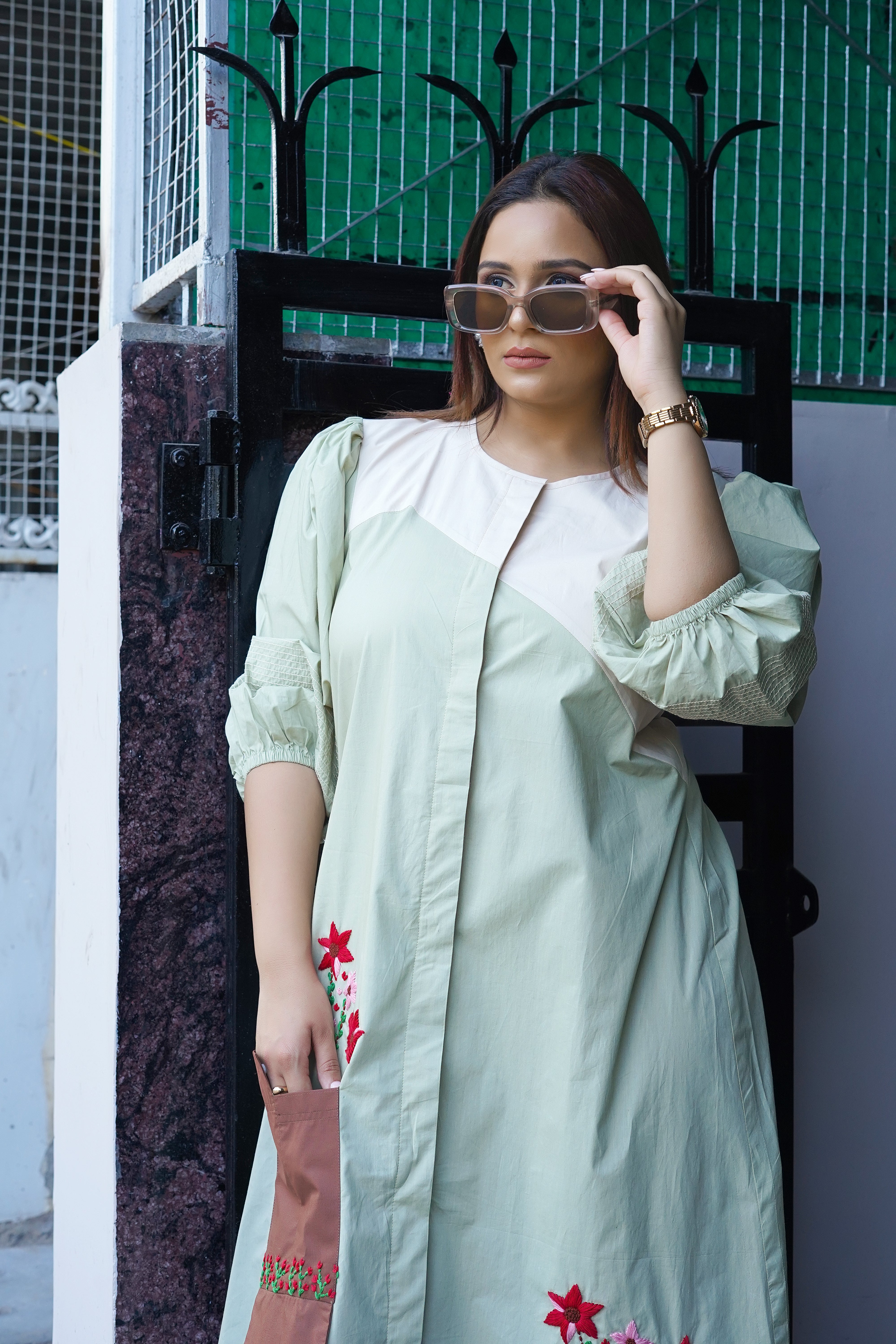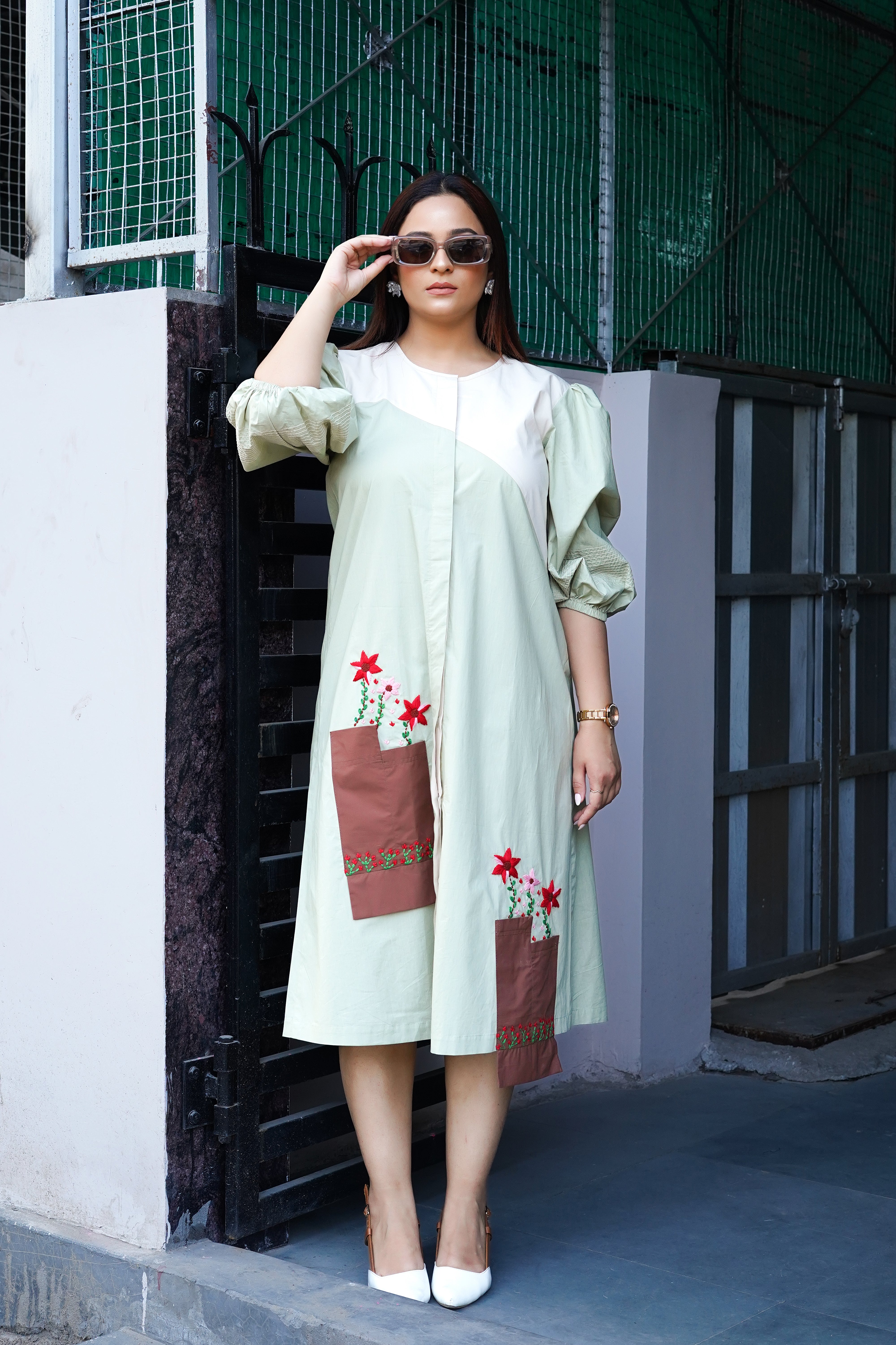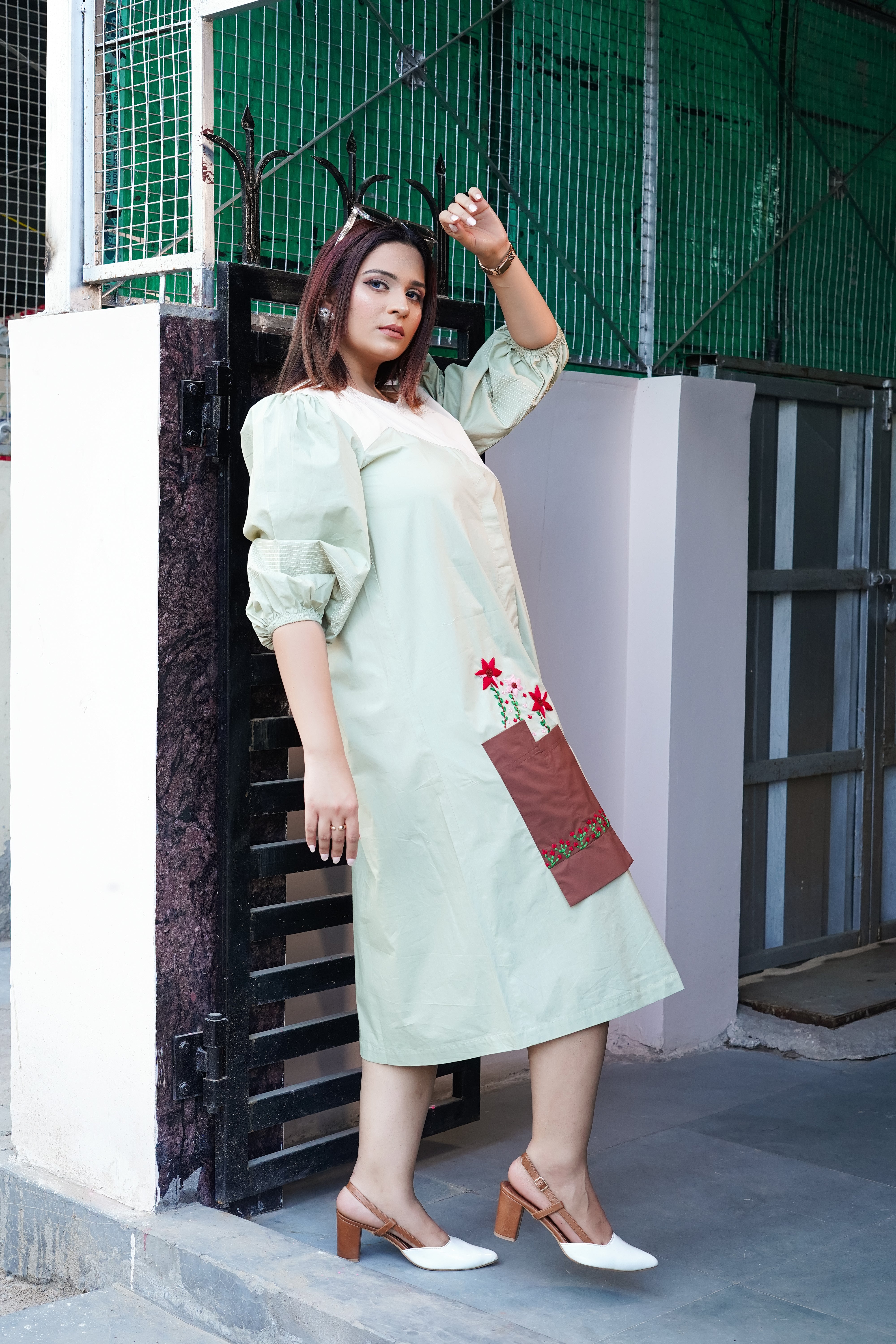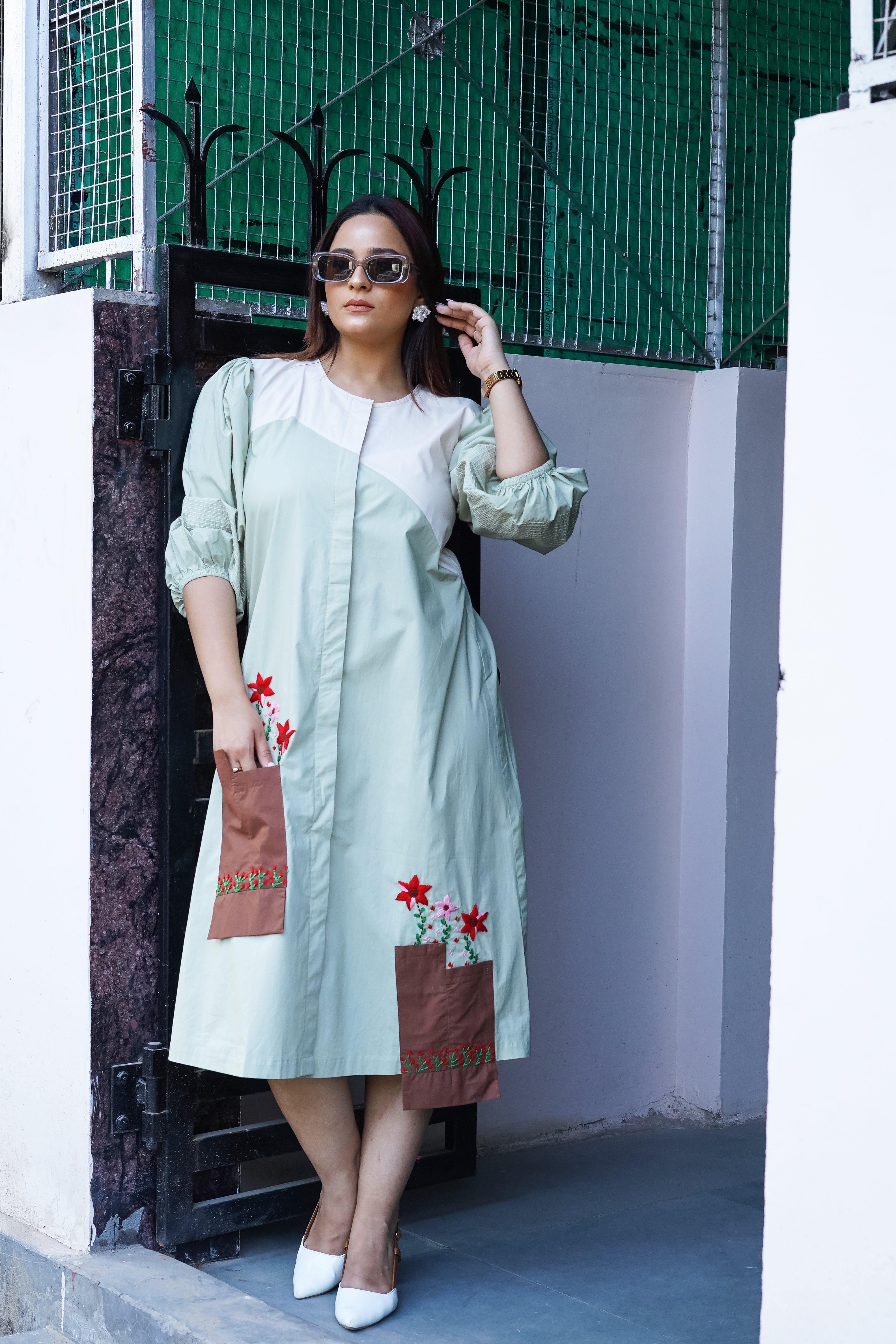 Mint Power is a refreshing blend of subtle charm and bold expression, crafted from soft mint green cotton poplin that feels as light as a summer breeze. The crisp off-white yoke brings a touch of structure, while voluminous puff sleeves add effortless grace. Earthy brown patch pockets, adorned with delicate floral embroidery, offer a playful, handcrafted detail that grounds the look with personality. Finished with a clean front placket for a minimalist edge, this dress is perfect for days when comfort meets quiet confidence whether you're strolling through city streets or stepping into a creative meeting, Mint Power makes an easy yet sophisticated statement.