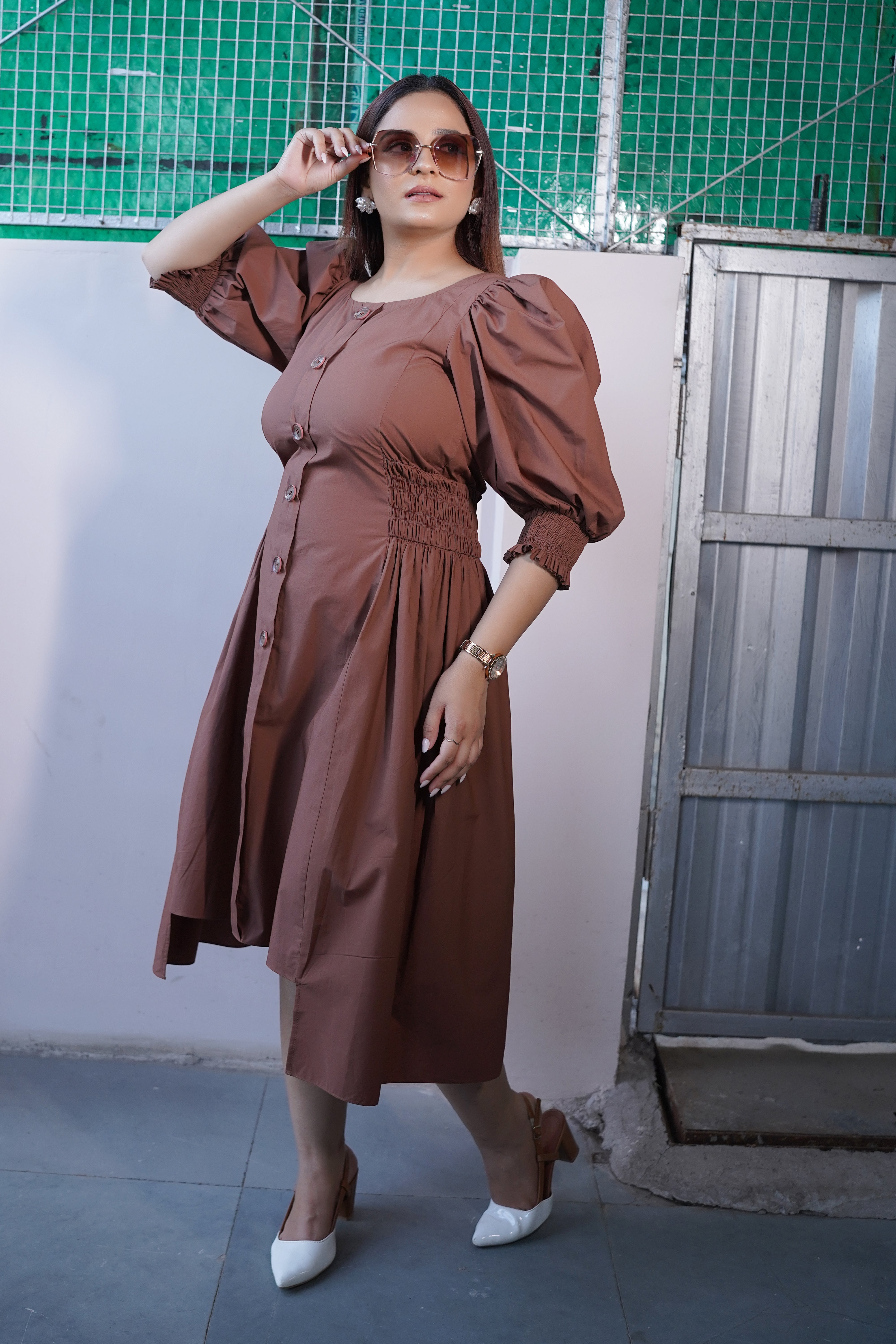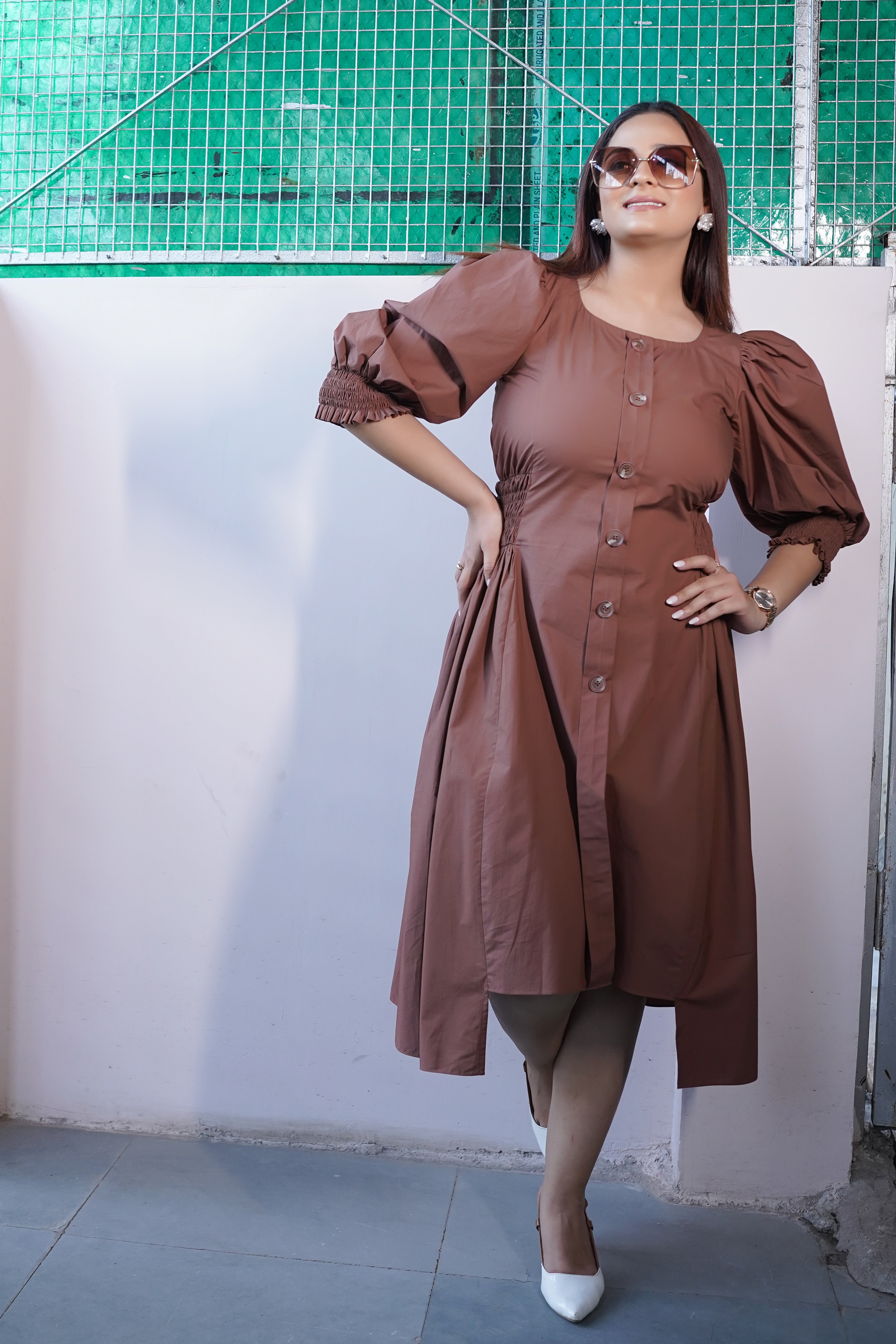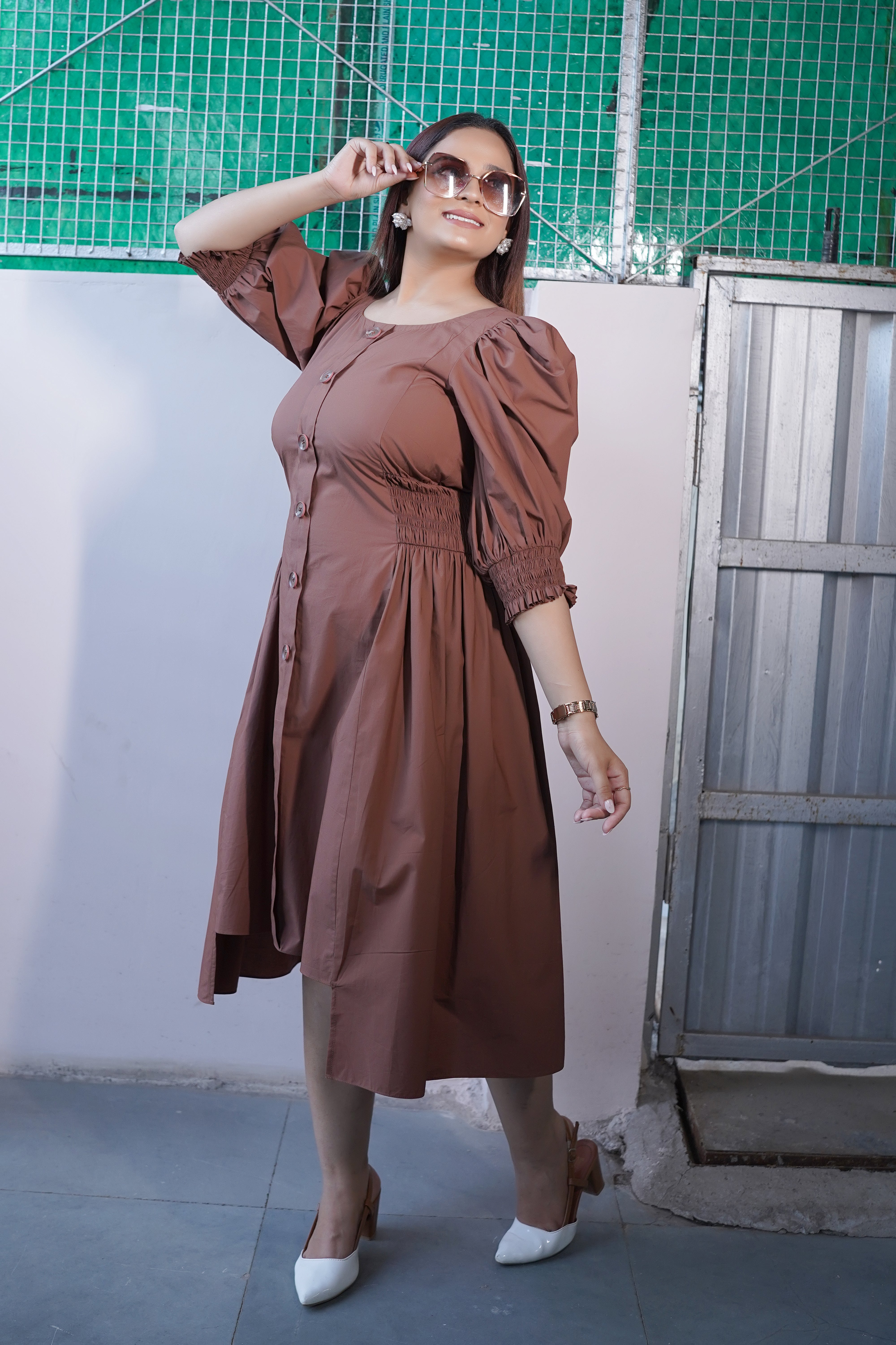 Timeless elegance meets modern style in mocha flow, a chocolate brown midi dress crafted from premium cotton poplin. Its structured yet breathable fabric, smocked waist, and button-down front make it the perfect blend of comfort and chic. Whether you're dressing up for a formal occasion or keeping it casual, this versatile dress is a must-have in your wardrobe.