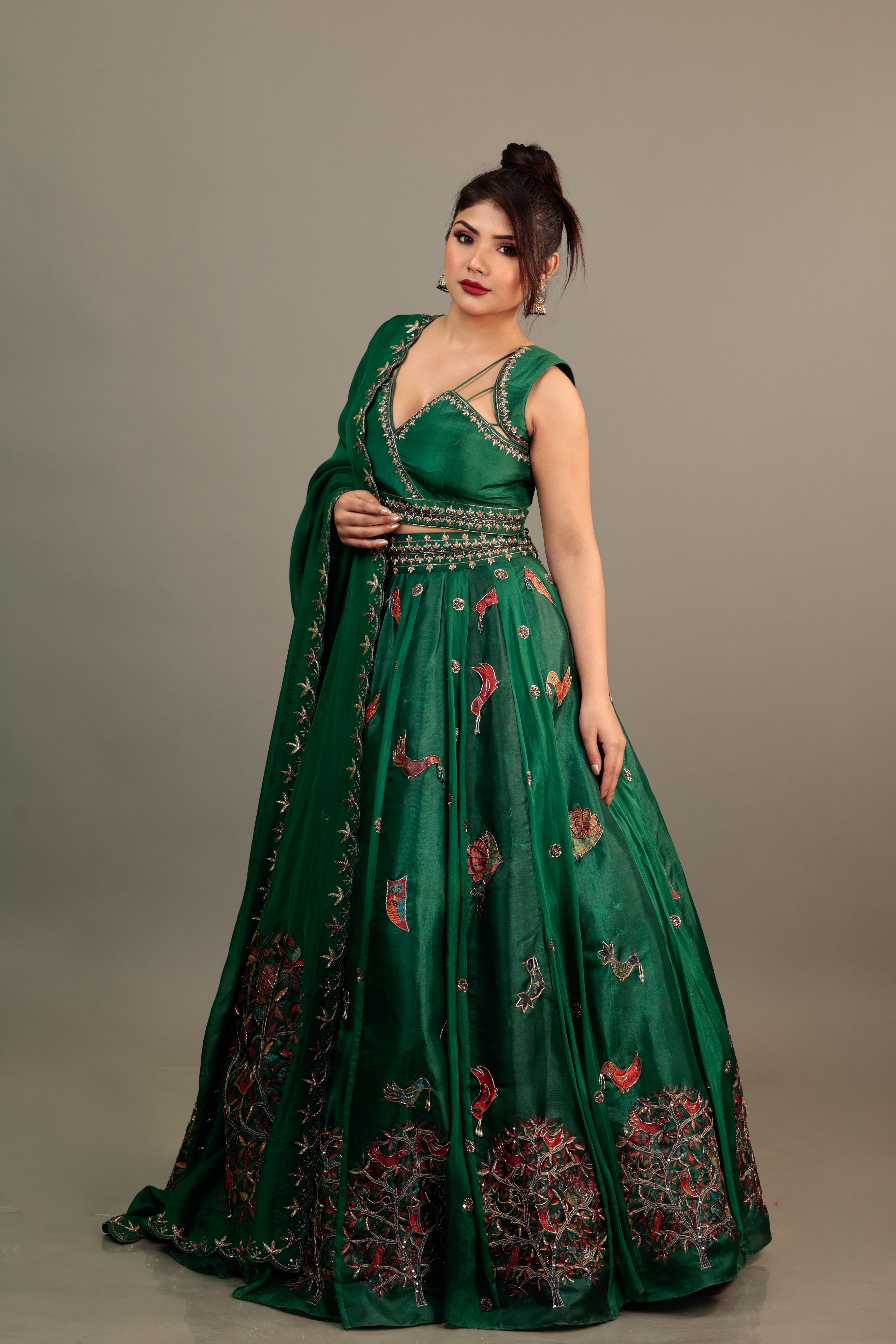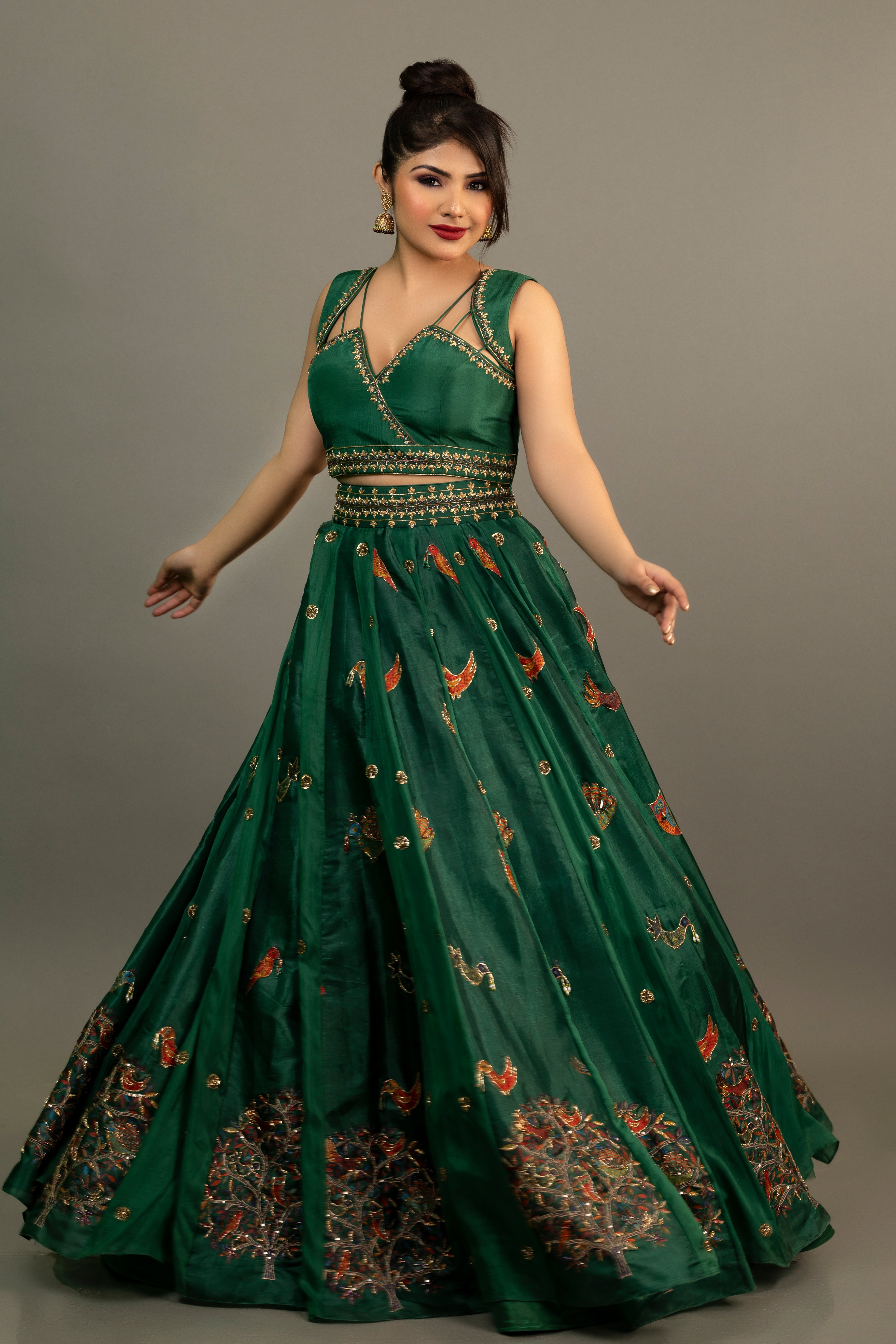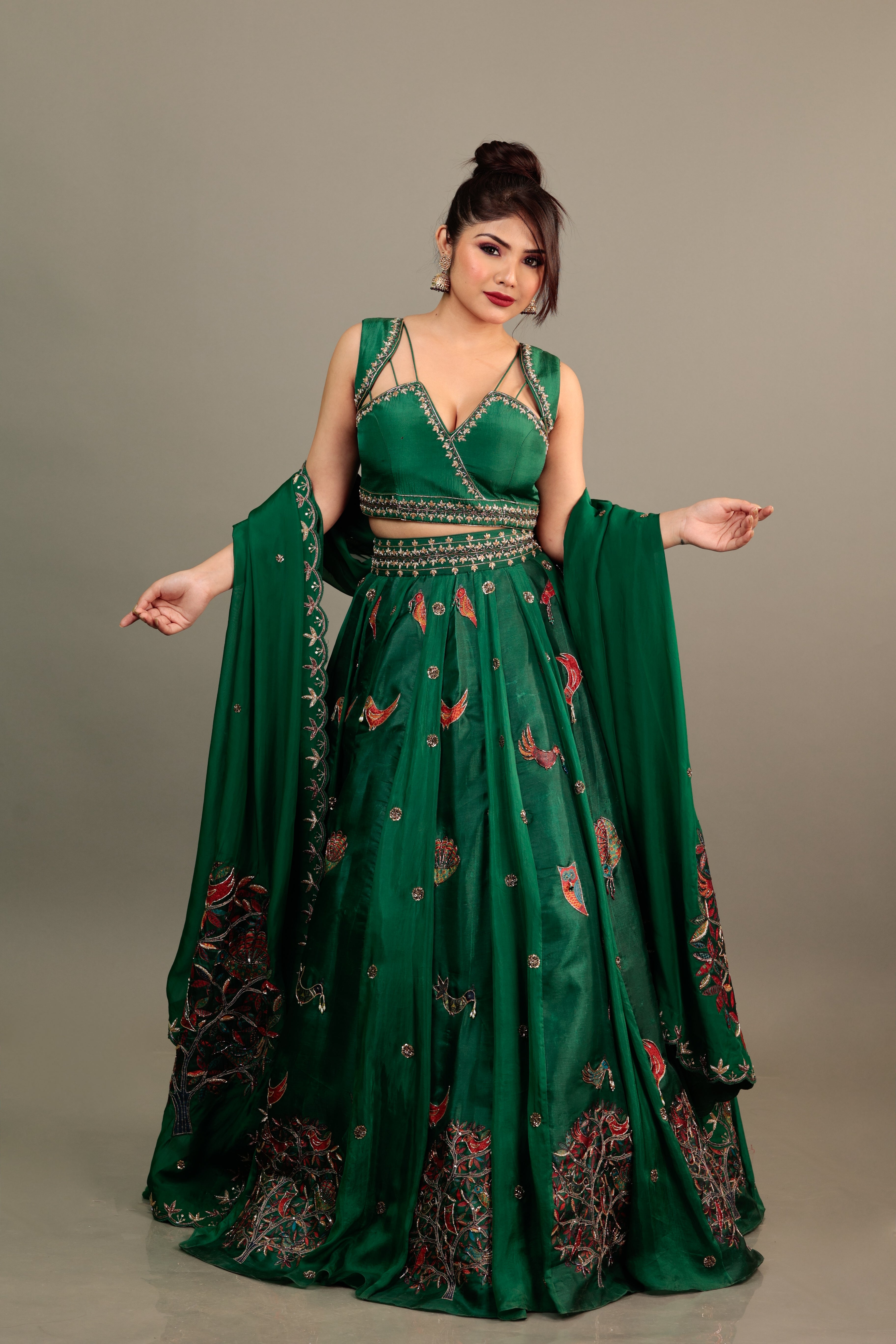 The Shajar-e-Falak Our Celestia collection includes this captivating green lehenga that will bring you to a world of celestial enchantment. Under the cosmic sky, each detail honors the balance of nature with a colorful tree theme and a variety of highlighted birds. With its distinctive crisscross back, the blouse gives the classic design a contemporary spin. Intricate embroidery ties the ensemble together, evoking the serene beauty of a forest set against a starry night. A stunning combination of earth and sky, Shajar-e-Falak combines traditional artistry with modern sophistication to create a striking focal point.