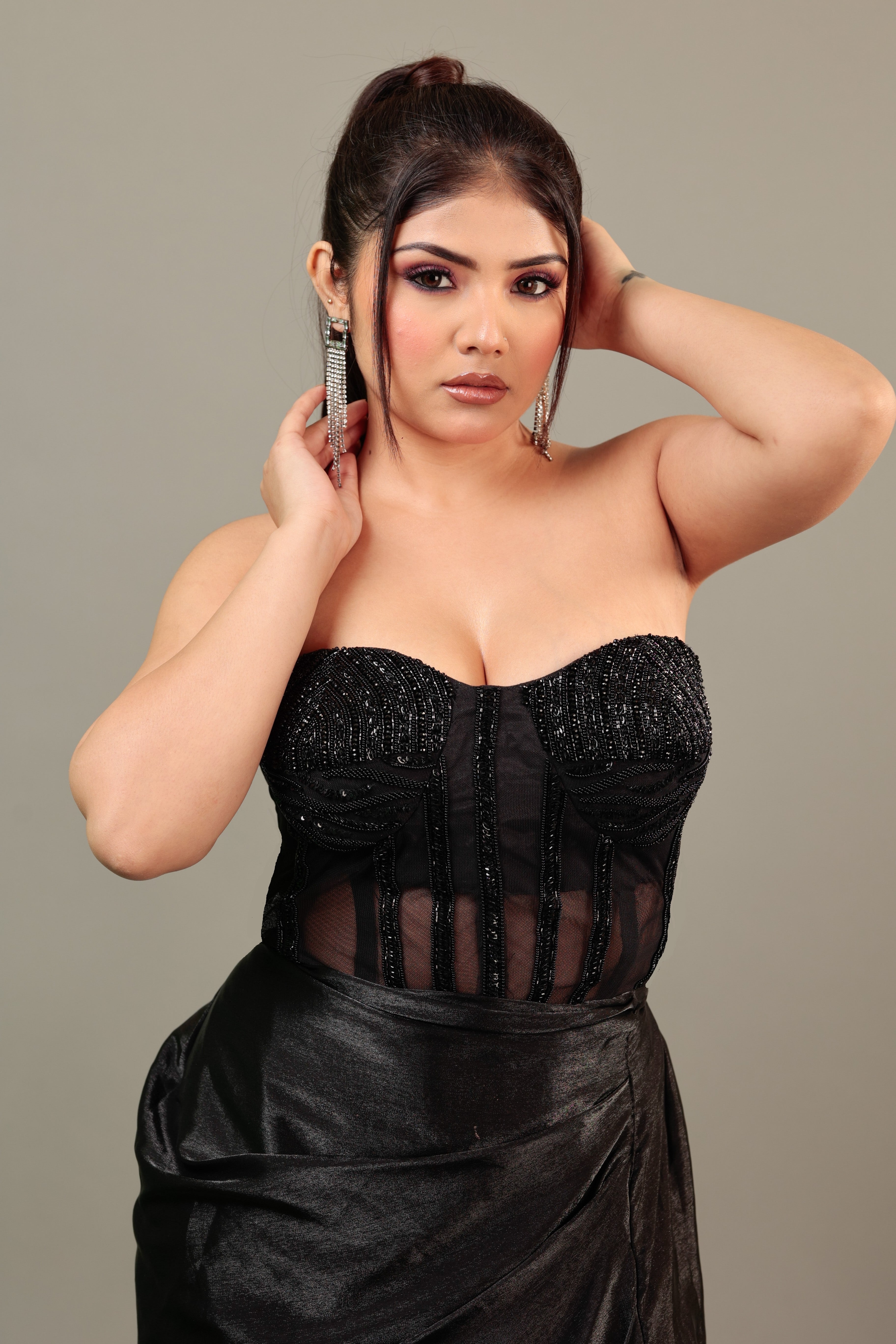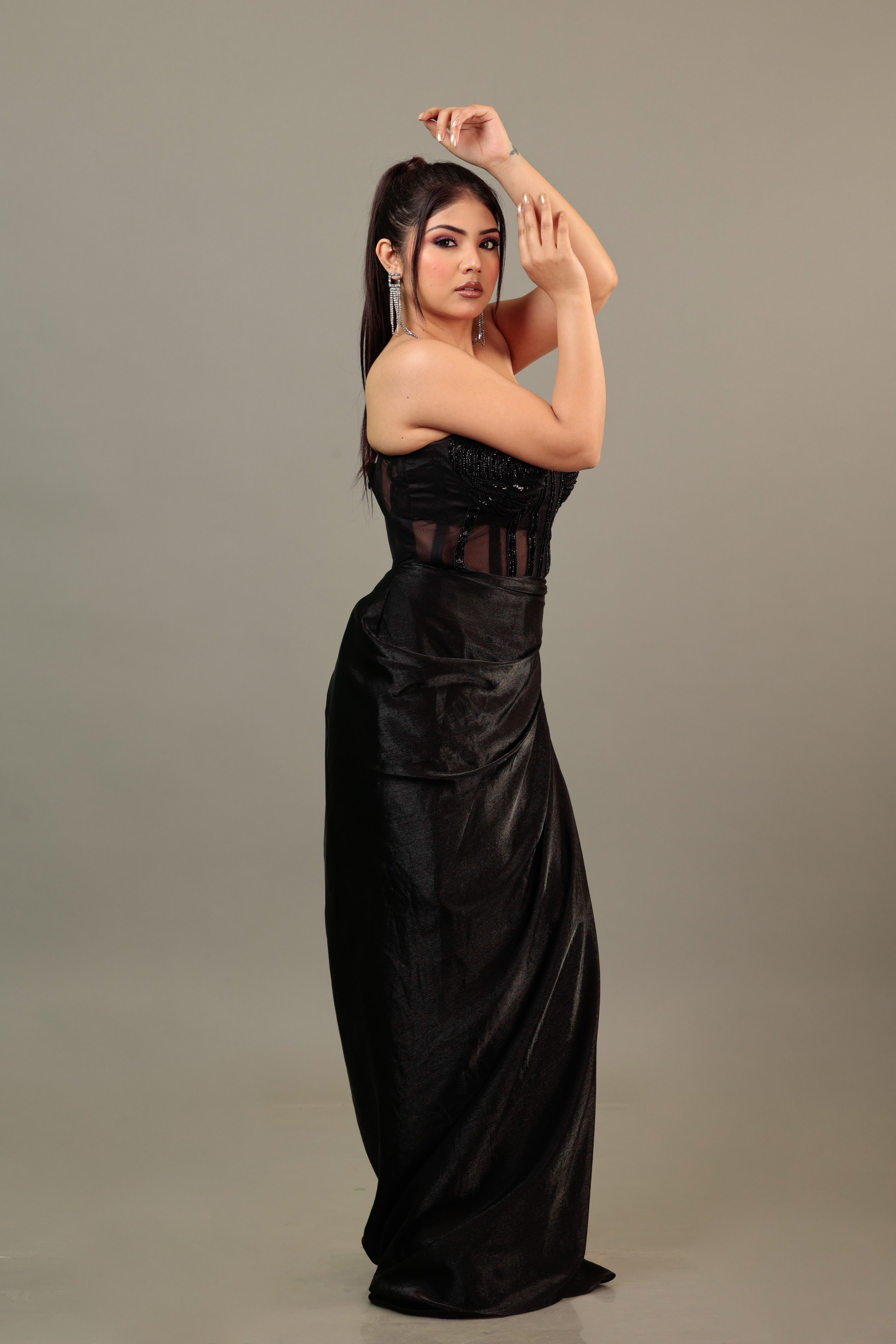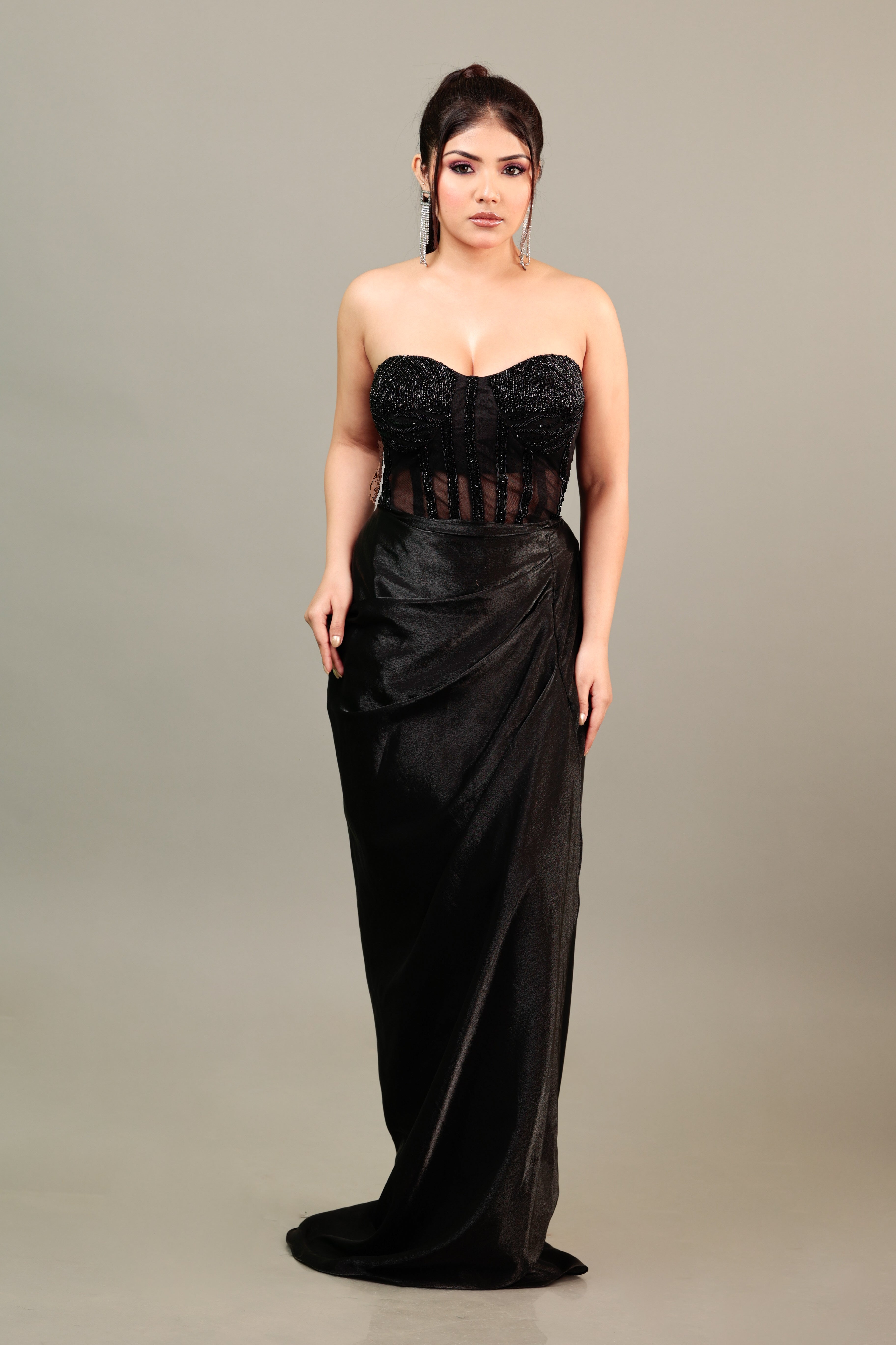 Sitaron ki Malika Embrace the cosmic allure of the night in this majestic black corset gown. Inspired by a starlit sky, the gown¡ tone-to-tone hand embroidery glimmers like celestial jewels, while a daring high slit adds modern glamour. The sheer back lends a hint of intrigue, accentuating the corset¡ structured silhouette. A proud member of our Celestia collection, this masterpiece captures the essence of a queen ruling under the vast tapestry of stars elevate your presence and shine like the Malika you are.